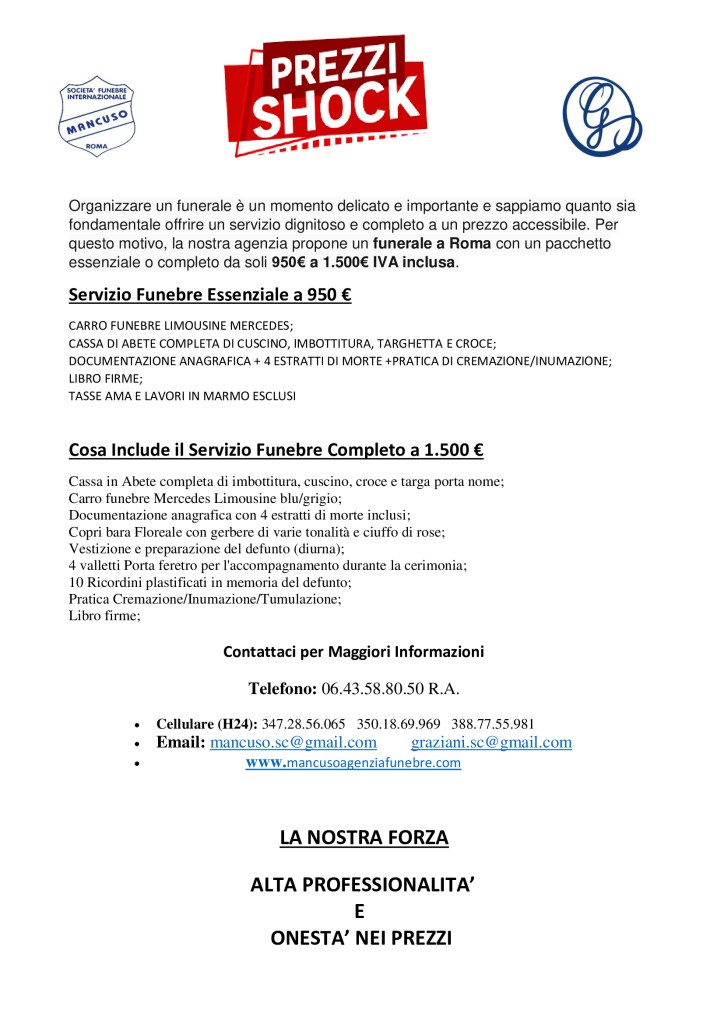 SERVIZIO FUNEBRE COMPLETO PER CREMAZIONE € 1.500 IVA INCLUSA!!!